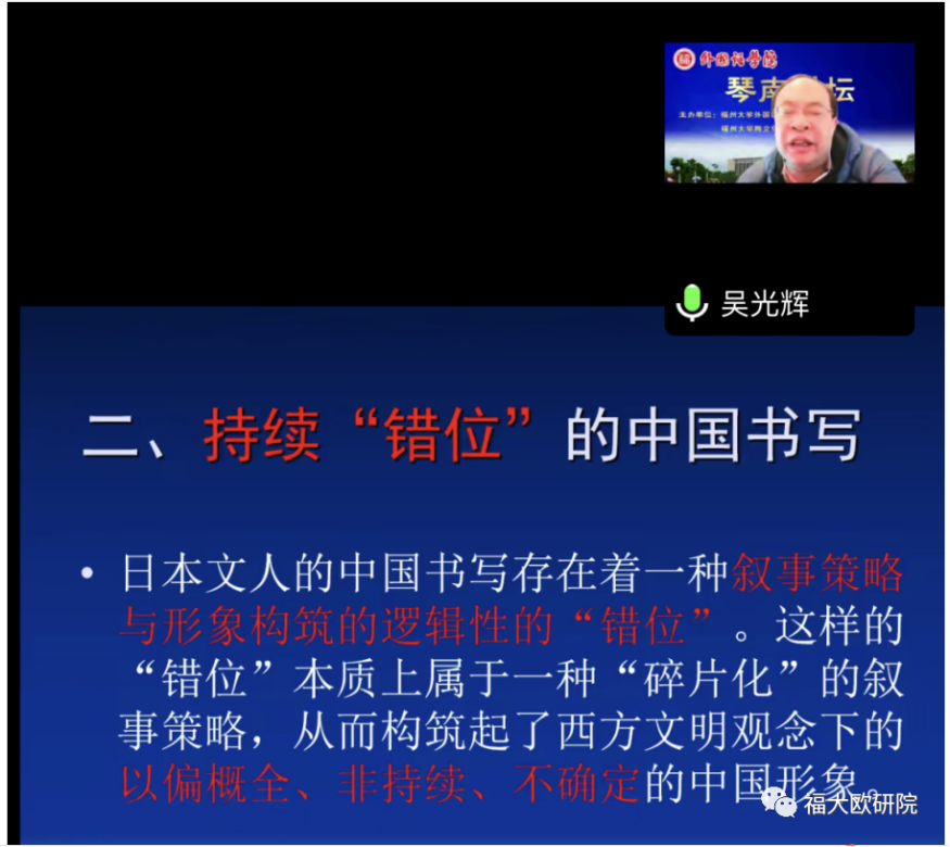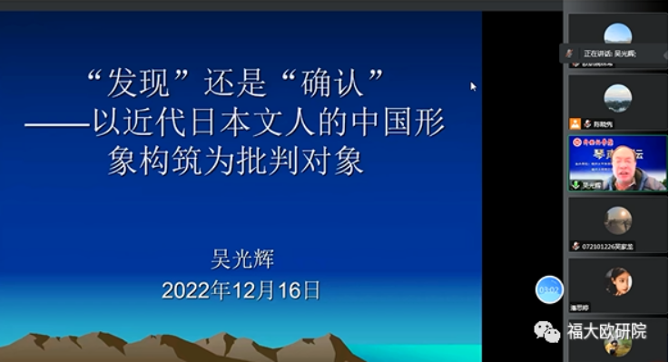 12月16日上午,厦门大学吴光辉教授在线担任欧洲研究院区域国别研究讲坛第2讲嘉宾,讲座题目为《“发现”还是“确认”—以近代日本文人的中国形象构筑为批判对象》。吴光辉教授为厦门大学外文学院教授、博士生导师,担任教育部日语教学指导委员会委员、中华日本哲学会(国家一级学会)副会长、中华日本学研究会常务理事、中国日语教学研究会华南分会副会长。在国内外公开发表学术论文70余篇,出版专著、译著等各类著述十余部,主持过多项国家级、省级课题项目。本场讲座由陈晓隽博士主持。在线参会师生人数达到了近100人。